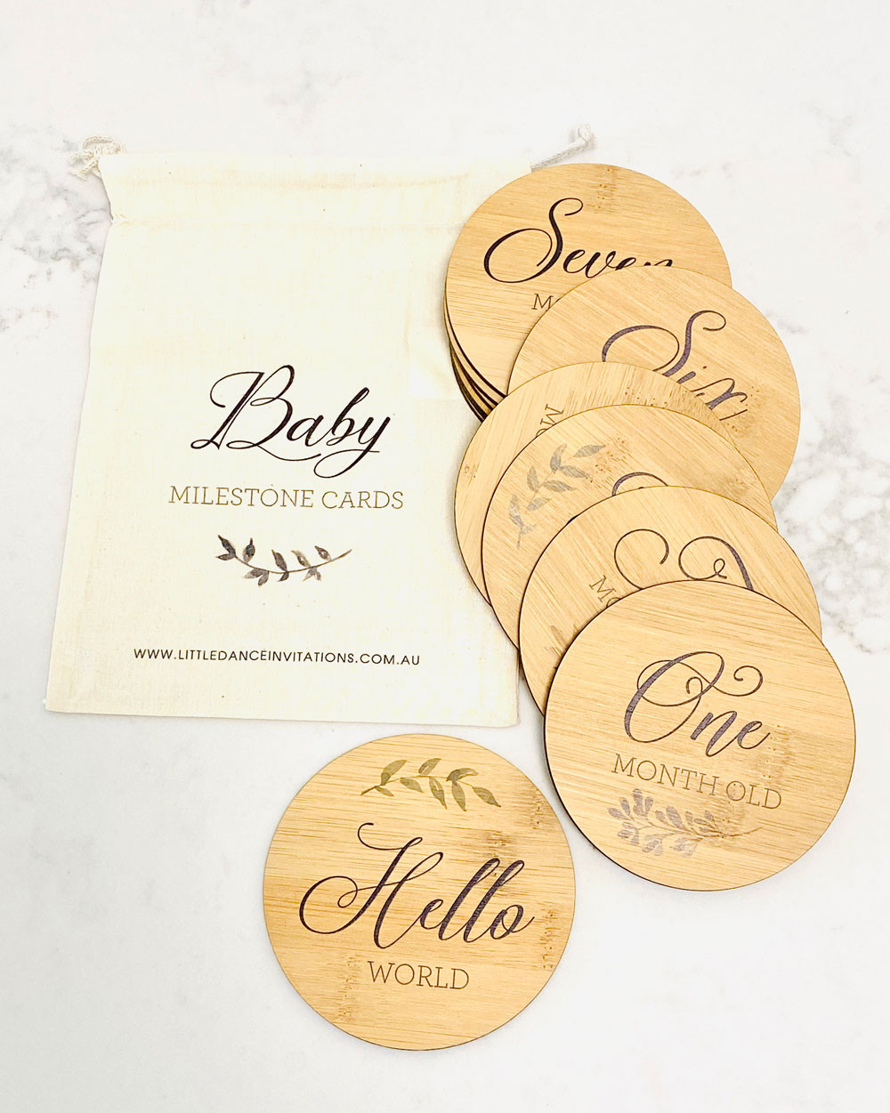 Beautifully crafted wooden or acrylic baby milestone cards are presented in a matching calico bag making a beautiful keepsake.